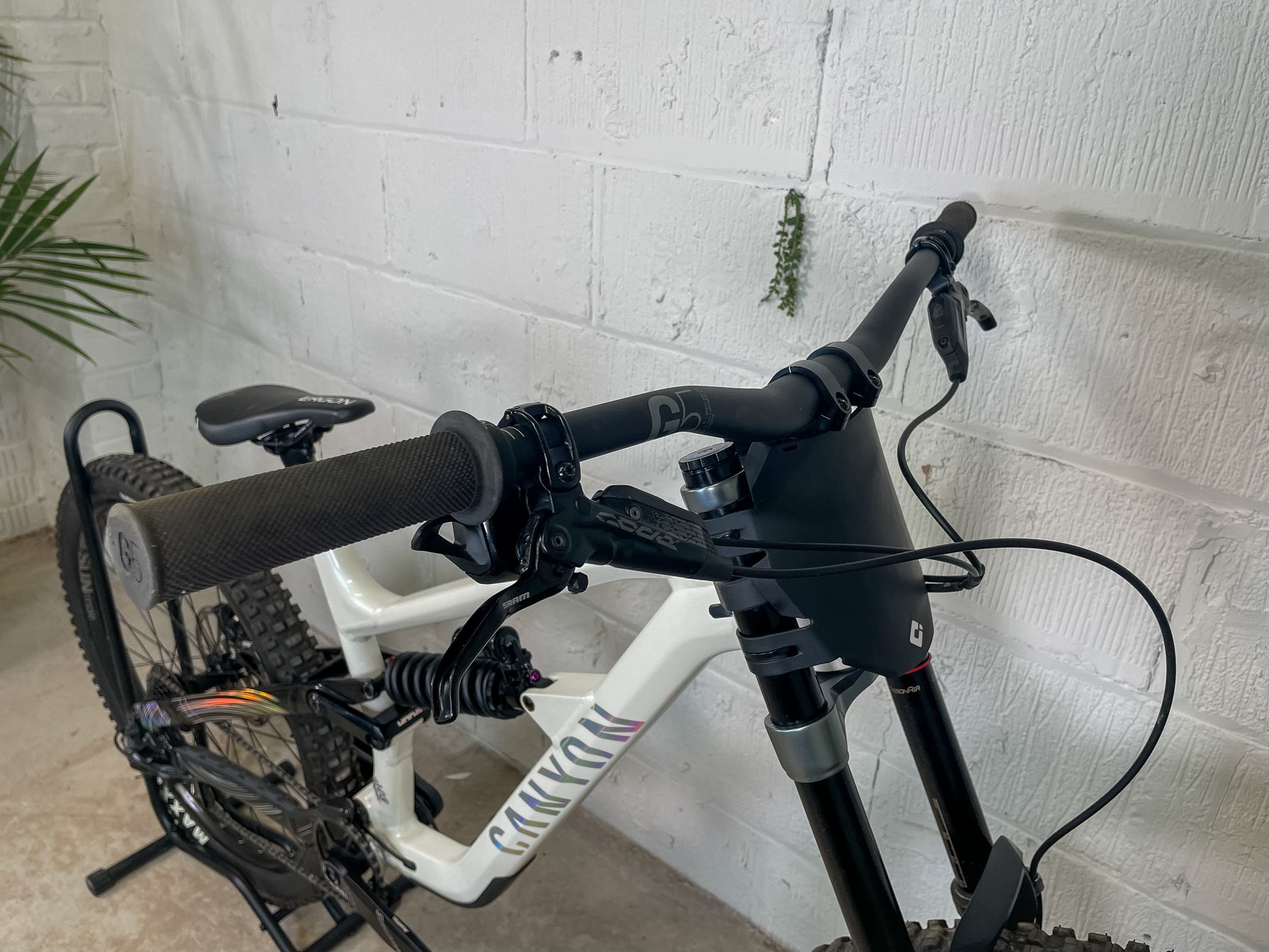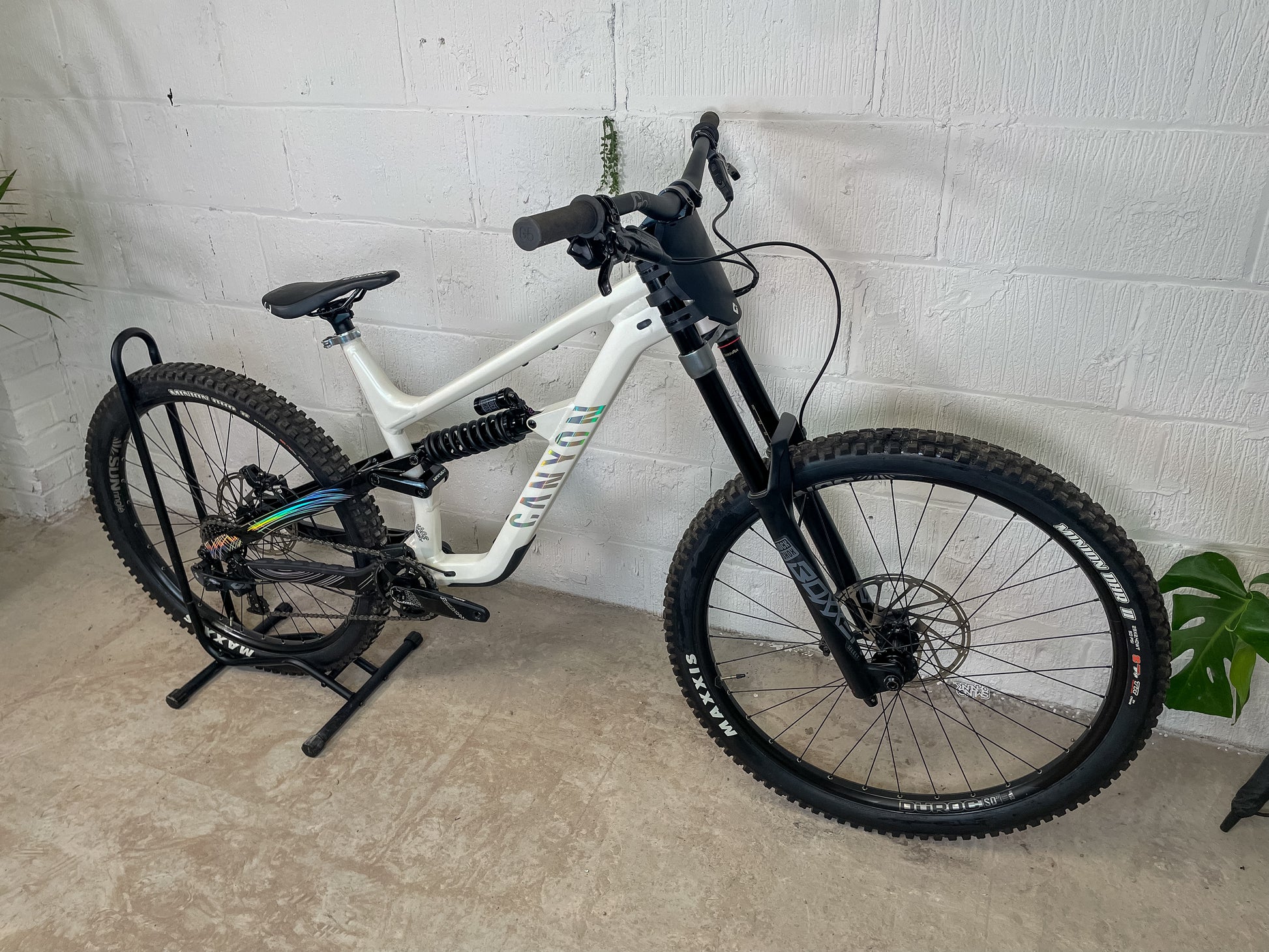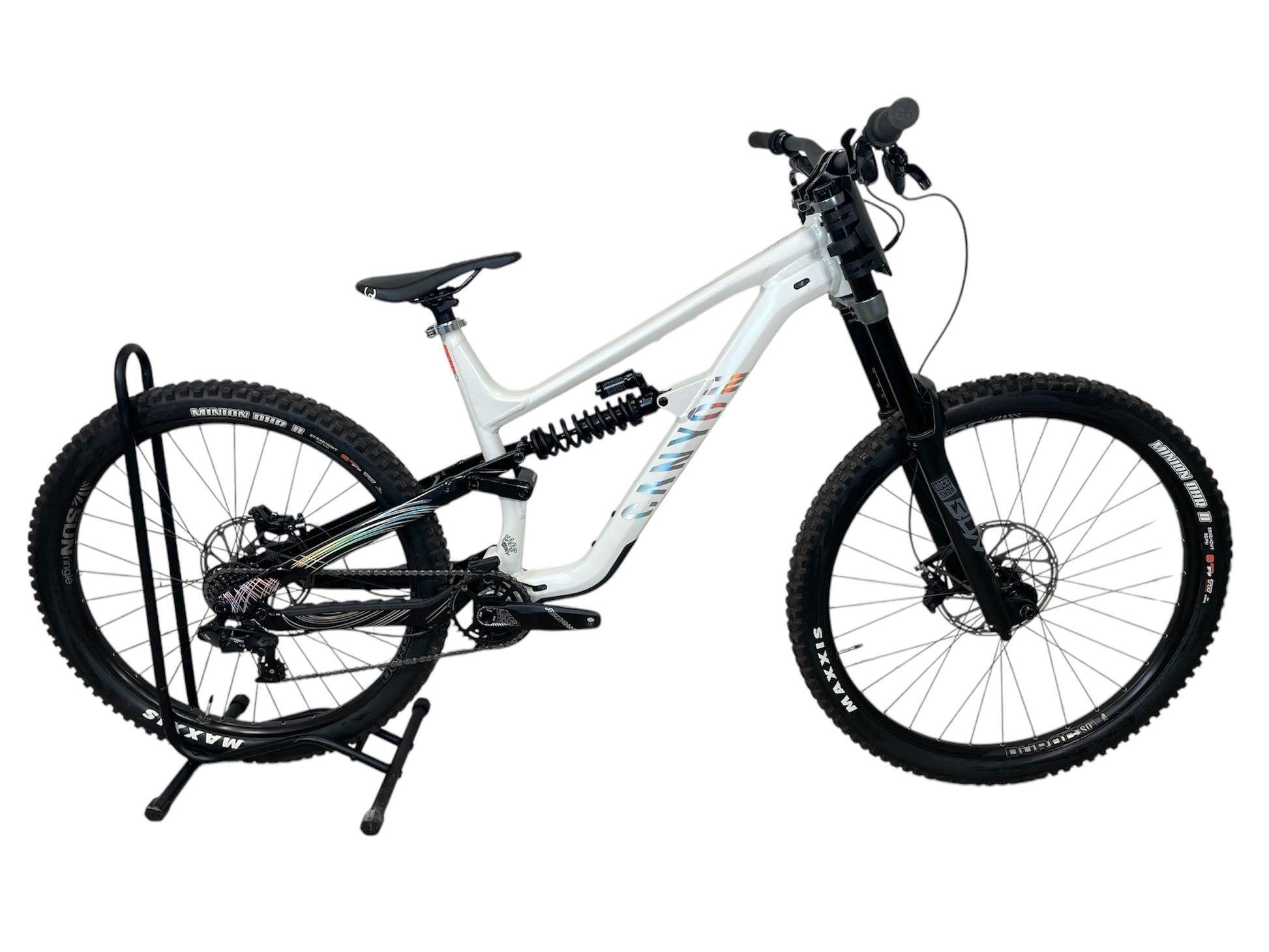 Available In Size XL. 1 Year warranty involved. RockShox Boxxer Base Forks on the front suspension With 190mm of travel and ROCK SHOX VIVID Coil Select on the rear offering a very comfortable ride with the ability to handle anything that’s thrown at it. SRAM GX DH 7s derailleur to make pedaling a breeze with a beautiful “Ice white” Colour way to finish it off.