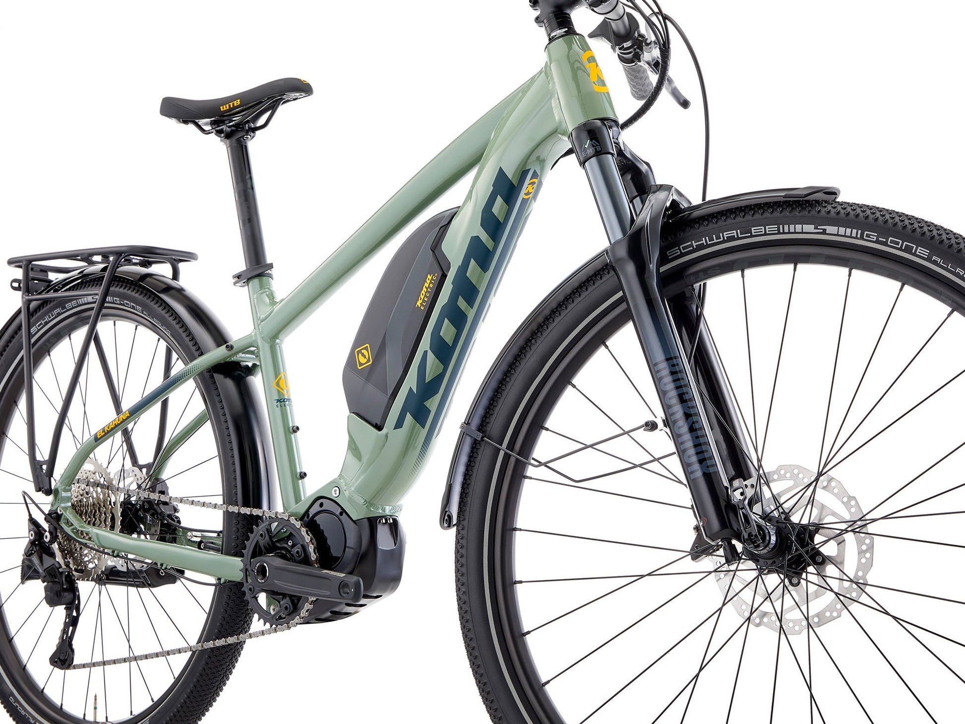 For those that love the idea of carrying gear with the assistance of an e-MTB the El Kahuna SUV is the answer! Like its sibling, the El Kahuna, the SUV features a sturdy aluminum frame and 29” wheels. The big differences are the addition of front and rear lights, and a rear rack which is integrated with a fender keeping you cleaner while you carry that camping gear up that big gravel road. A 100mm fork smooths out the bumps, and powerful disc brakes keep you in control while you rally around the campground’s gravel trails and singletrack.