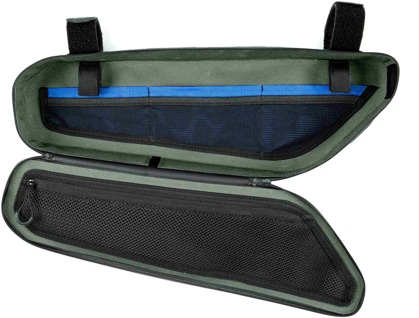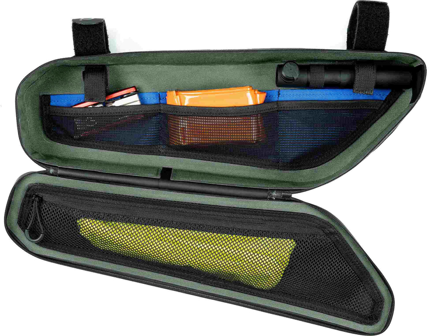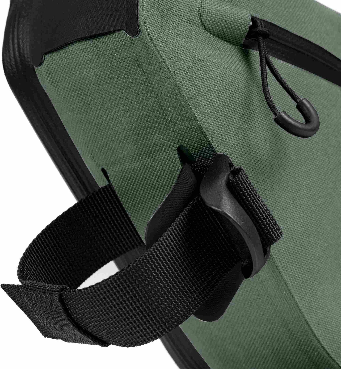 The entire PACK PRO bikepacking series was developed in cooperation with experienced bikepackers. The PRO 2 is the smallest frame bag in this series. Its PVC-free, welded construction is waterproof and the outer is constructed from durable material that's easy to care for. The MOLLE system offers flexibility in spades, allowing the bag to attach easily to a wide variety of frames. Side zip pockets with smooth-running zips are perfect for stashing small items. We put just as much attention into designing the interior: multiple compartments are perfect for organising tools, spares and more, while the colour-contrasting material makes it easy to find everything. Reflective details improve visibility on the roads in low-light conditions.