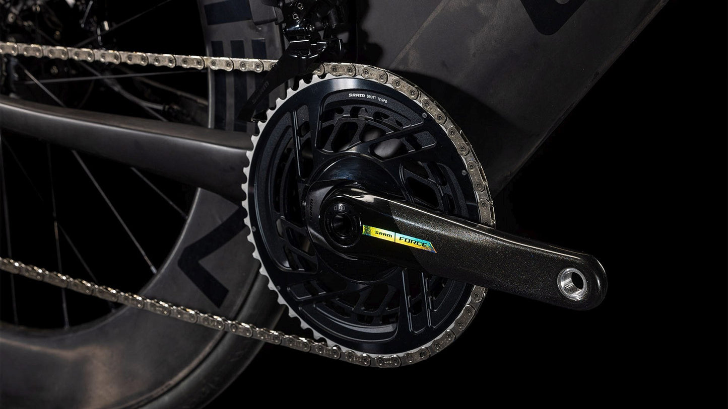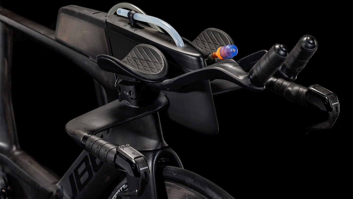 We left nothing on the table in our quest to make the Aerium C:68X SLX the most efficient bike on the road, period. Its sophisticated aero design means it's the fastest time trial bike we've ever built, even with the challenge of incorporating hydraulic disc brakes. We added configurable hydration and storage options, including the ability to run up to two hydration systems for better self-sufficiency, even during long races. We fitted a Newmen Advanced SL R.65/80 Streem carbon wheelset shod with Continental Grand Prix tyres for rapid acceleration, superior aero performance and safe cornering grip. The CUBE C:68 cockpit system is available in high or low configurations to suit your needs, with a huge range of adjustment for the aero bars. A Sram Force AXS drivetrain puts the right gear at your fingertips – literally – with the option of running a front derailleur. And absolutely all of it is crafted from our premium C:68X carbon, with configurable options hidden behind easily removed but fully aero access hatches. We sweated the detail, so your sweat can be translated into pure speed.