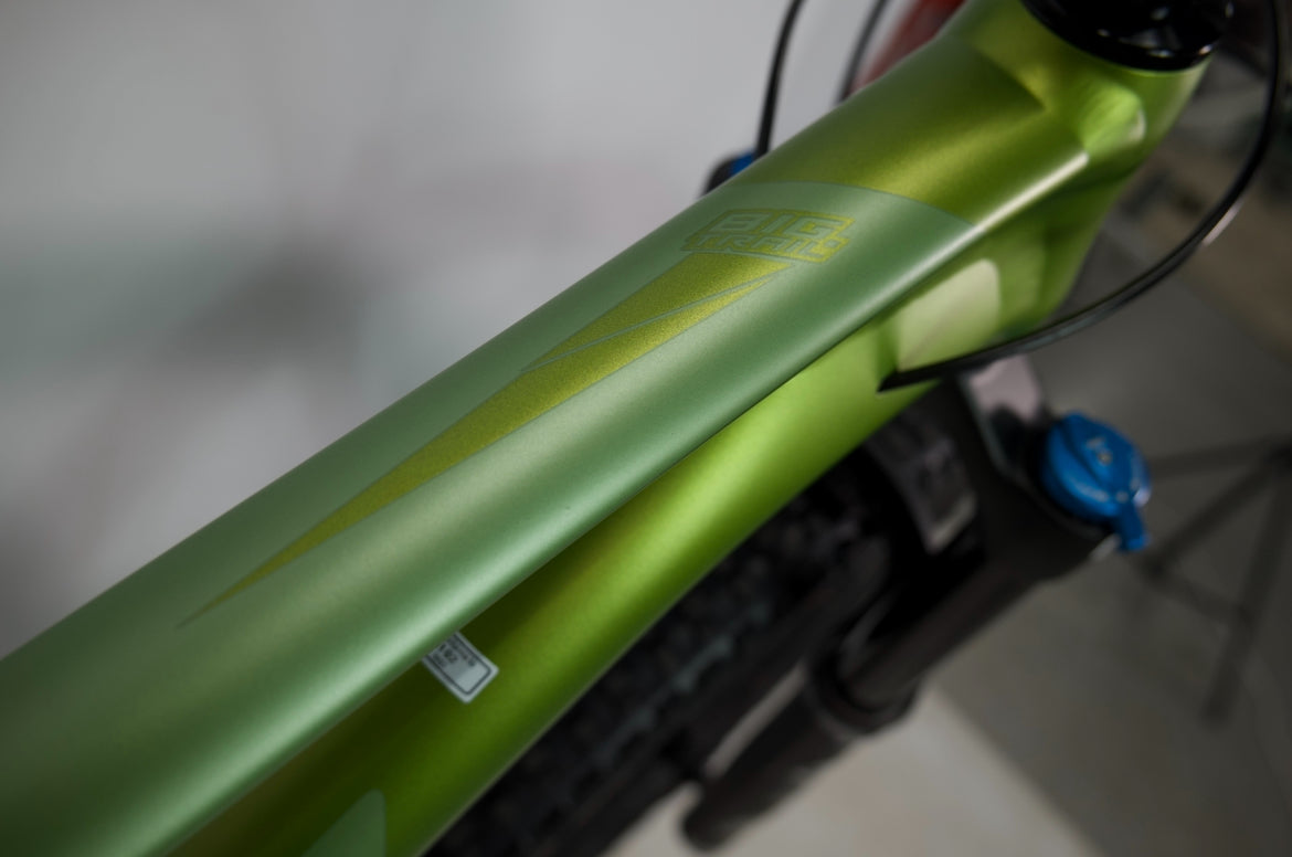 Shimano XT; SGS derailleur with a 12 speed cassette making pedaling a breeze with a beautiful “Green” Colour way to finish it off.