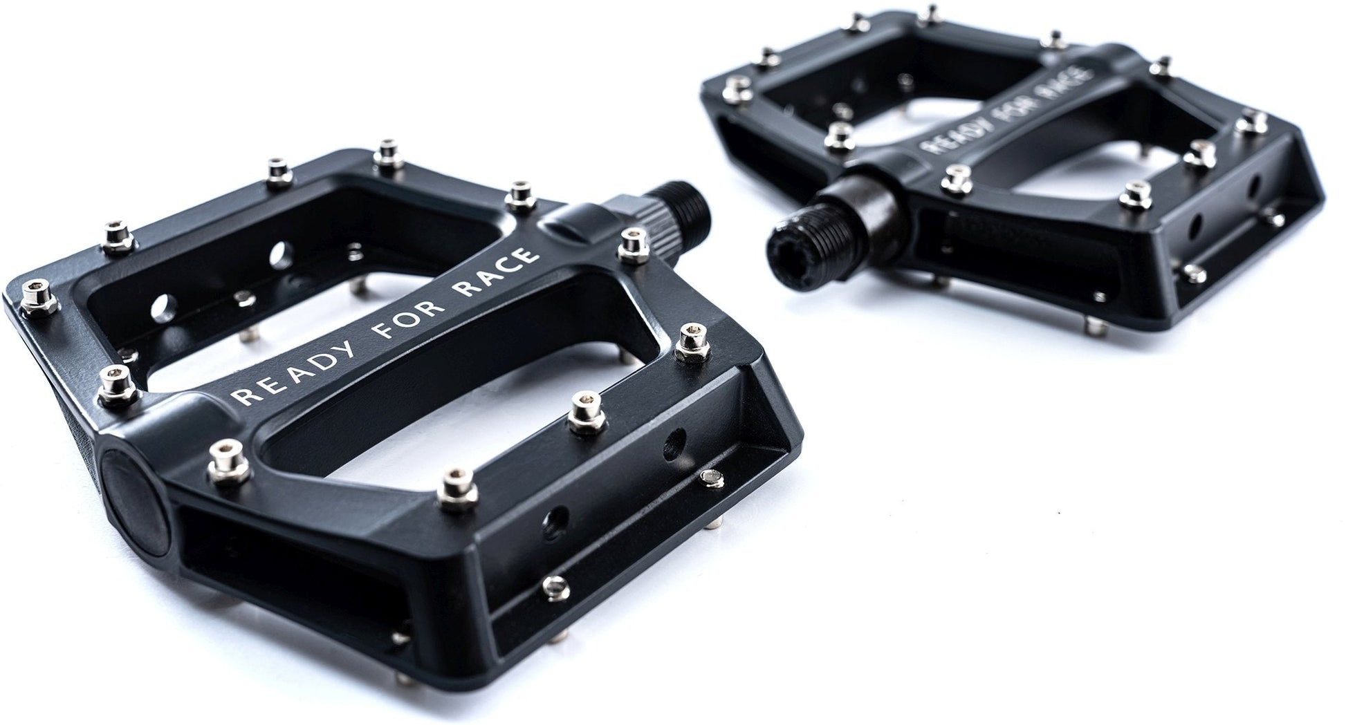 These lightweight aluminum flat pedals are installed with a CrMo axle. The non-slip pins are changeable and offer the best grip on the bike.