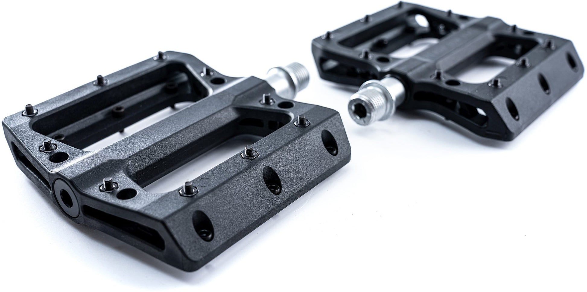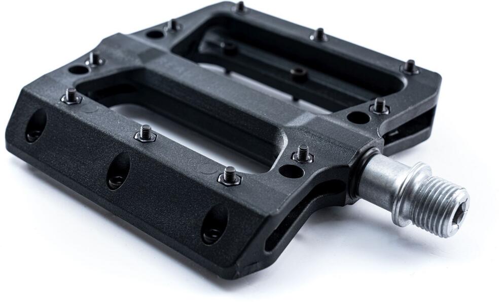Ultra-light flat pedal made of technical thermoplastic. Industrially stored, with changeable non-slip pins and CrMo axle.