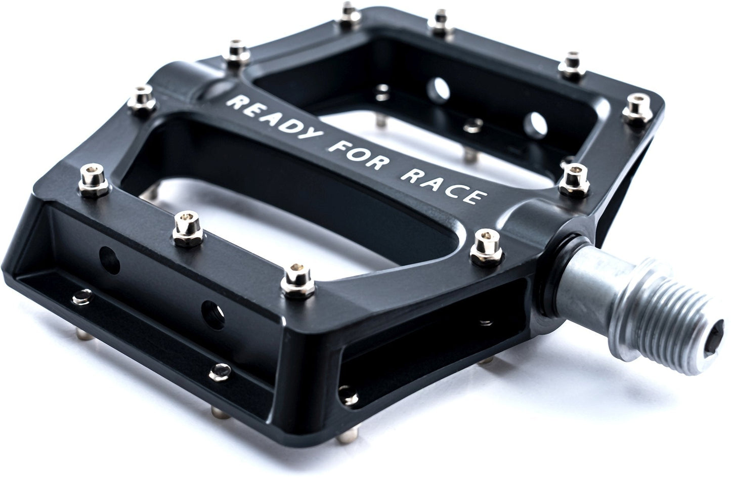 These lightweight aluminum flat pedals are installed with a CrMo axle. The pedals are mounted with high-quality bearings. The non-slip pins are changeable and offer the best grip on the bike.