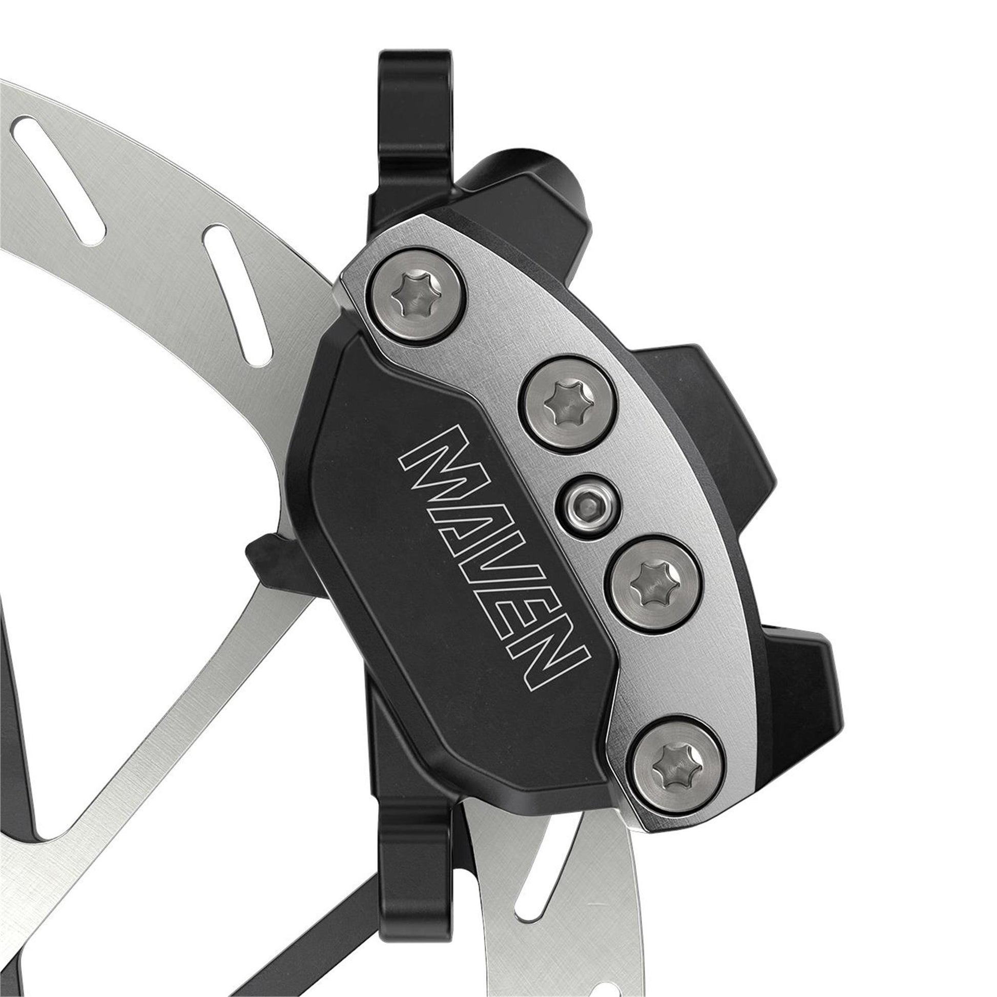 Modern mountain bikes have redefined what riders are capable of, pushing the requirements for heavy-duty power further than ever before. Maven Ultimate is our answer to that evolution, with monstrous 18 and 19.5-millimeter pistons driving 50% more power than Code. But best-in-class power means nothing unless you’re able to harness it. Swinglink translates rider input for progressive power throughout the lever pull, maintaining SRAM’s signature ride feel. And because of a stiff 4-bolt caliper that sheds an incredible amount of heat, that feel remains consistent, so the last corner feels like the first corner. But with so much baseline power on hand, there is more range than ever before to tune the ride qualities to exactly how you want with different pad materials, and rotor sizes. Maven Ultimate pairs a sleek high polish lever body to a caliper with machined edges and titanium hardware for a finish worthy of any modern super bike. And for unrivaled ease of customization, features tool-free Reach and Contact Point Adjust. Maven is the expert, but Maven Ultimate is the pinnacle.